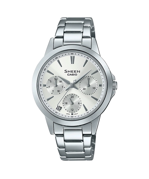 ساعت کاسیو SHE-3516D-7AUDF از مجموعه SHEEN، انتخابی عالی برای خانمهایی است که به دنبال ترکیب زیبایی کلاسیک و امکانات کاربردی هستند. صفحه آنالوگ این مدل سفید و براق است و با طراحی چند موتوره (مولتیفانکشن)، علاوه بر نمایش ساعت و دقیقه، امکان مشاهده تاریخ و روز هفته را هم فراهم میکند. بند و قاب ساعت کاملاً از استیل ضد زنگ با کیفیت بالا ساخته شده و مقاومت فوقالعادهای در برابر زنگزدگی و خراشیدگی دارد. شیشه معدنی مقاوم، قفل کلیپسی مطمئن و مقاومت در برابر آب تا عمق ۵۰ متر از مزایای اصلی این مدل محسوب میشوند. اگر برای خرید ساعت SHEEN اصل یا خرید ساعت شین اورجینال به دنبال ساعتی متفاوت و مجهز هستید، SHE-3516D-7AUDF همان انتخاب ایدهآل خواهد بود.