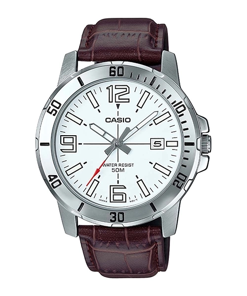 ساعت کاسیو مدل MTP-VD01 از سری ساعت‌های آنالوگ مردانه این برند ژاپنی است که با طراحی کلاسیک و شیک، برای استفاده روزمره و رسمی مناسب می‌باشد. این مدل دارای قاب استیل ضد زنگ با پوشش براق و صفحه ساده با شاخص‌های خوانای ساعت است.