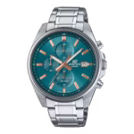 ساعت مچی Casio Edifice EFV-610DE-2A ترکیبی از استایل مدرن و عملکرد دقیق است. این مدل با طراحی اسپرت و درعینحال ظریف خود، برای استفاده روزمره و موقعیتهای رسمی انتخابی ایدهآل محسوب میشود. قاب استیل ضدزنگ با قطر ۴۳.۸ میلیمتر و صفحهی آبی تیرهی براق، جلوهای شیک و حرفهای به ساعت بخشیده است.