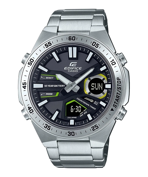 ساعت کاسیو EFV-C110D-1A3VDF یکی از خاصترین مدلهای سری Edifice است که با ترکیب نمایش دیجیتال و آنالوگ، انتخاب افراد حرفهای و خوشسلیقه خواهد بود. این مدل با قاب و بند استیل ضد زنگ، ظرافت را با استحکام در هم آمیخته است. خرید ساعت Edifice برای کسانی که به دنبال تکنولوژی، طراحی مدرن و کیفیت ساخت ژاپنی هستند، یک گزینه برجسته به شمار میآید. امکاناتی چون نشانگر تاریخ، تایمر، ساعت جهانی، آلارم و کرنومتر، در کنار مقاومت قابل توجه این سری، EFV-C110D-1A3VDF را به یک ساعت چندکاره و همهفنحریف بدل کرده است. خرید ساعت Edifice اورجینال این اطمینان را میدهد که محصولی با دوام، دقیق و کارآمد در اختیار خواهید داشت؛ به ویژه اگر به خرید ساعت های Edifice با کاربرد همهروزه و ظاهر جذاب علاقه دارید.