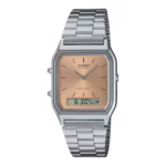 ساعت Casio AQ-230A-4AMQY از سری محبوب Vintage کاسیو، بازگشتی زیبا به طراحی کلاسیک دهههای گذشته است. این مدل با ترکیب نمایشگر آنالوگ و دیجیتال در قاب مربعی و رنگ رزگلد ملایم، حس نوستالژی و مدرنیته را همزمان در خود جای داده است.