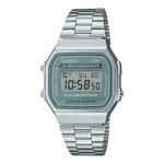 ساعت دیجیتال کلاسیک Casio A168 یکی از محبوب‌ترین و نمادین‌ترین مدل‌های کاسیو با طراحی رترو و نوستالژیک است. این ساعت با بدنه استیل نقره‌ای و صفحه نمایش LCD همراه با نورپردازی پس‌زمینه، ترکیبی از سبک قدیمی و کاربردی مدرن را ارائه می‌دهد.