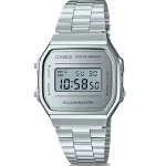 ساعت دیجیتال کلاسیک Casio A168 یکی از محبوب‌ترین و نمادین‌ترین مدل‌های کاسیو با طراحی رترو و نوستالژیک است. این ساعت با بدنه استیل نقره‌ای و صفحه نمایش LCD همراه با نورپردازی پس‌زمینه، ترکیبی از سبک قدیمی و کاربردی مدرن را ارائه می‌دهد.
